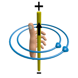 Dazu legt man die linke Hand so um den Leiter, dass der Daumen in Richtung des Elektronenflusses zeigt (also von - nach +). Die Richtung der Finger zeigt dann die Richtung des Feldes an.